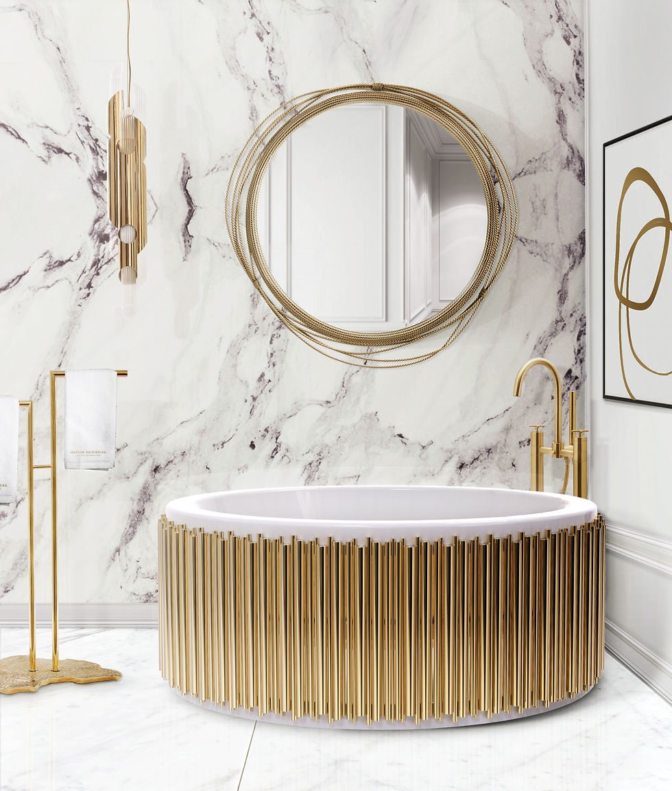 Luxury bathroom interior with black marble walls, sculptural freestanding bathtub, ornate mirror, and gold accent lighting by Valdo Luxury.